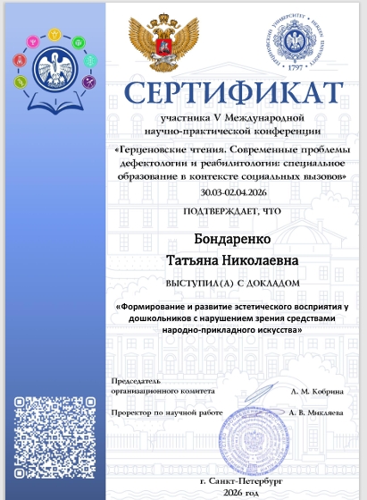 30.03.26 Приняла участие в V международной научно-практической конференции "Герценовские чтения. Современные проблемы дефектологии и реабилитологии: специальное образование в контексте социальных вызовов" и выступила с докладом "Формирование и развитие эстетического восприятия у дошкольников с нарушением зрения средствами народно-прикладного искусства."